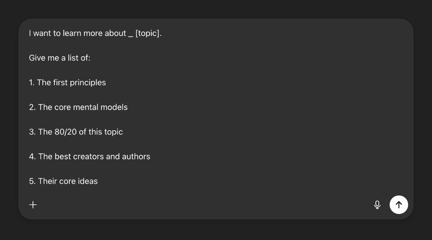 I usually ask it about the first principles, mental models, and most common ideas.