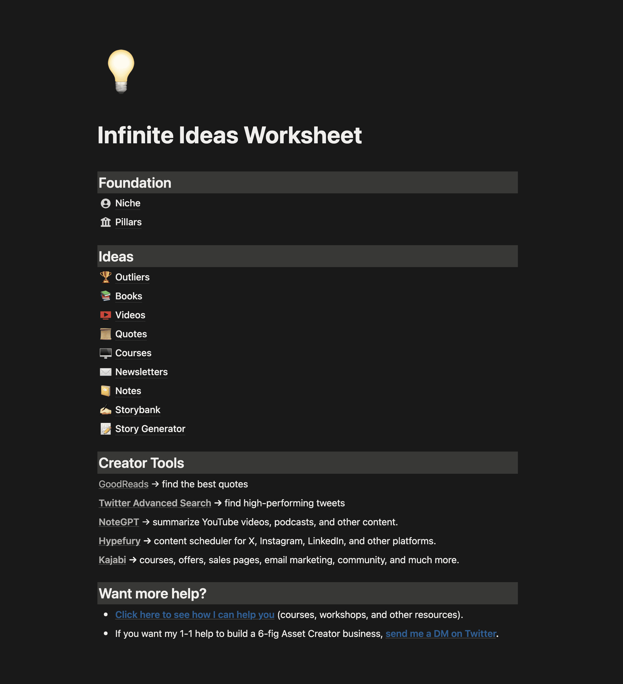 4. Work with me 1-1. DM me ‘AC’ (or reply via email) if you want my help to build a 6-fig Asset Creator business with +50K followers and 10M-100M organic views per year. The Asset Creator model only requires 2-4 hours per day and we focus only on content, emails, and digital assets (no cold outreach, sales calls, or sleazy tactics).
