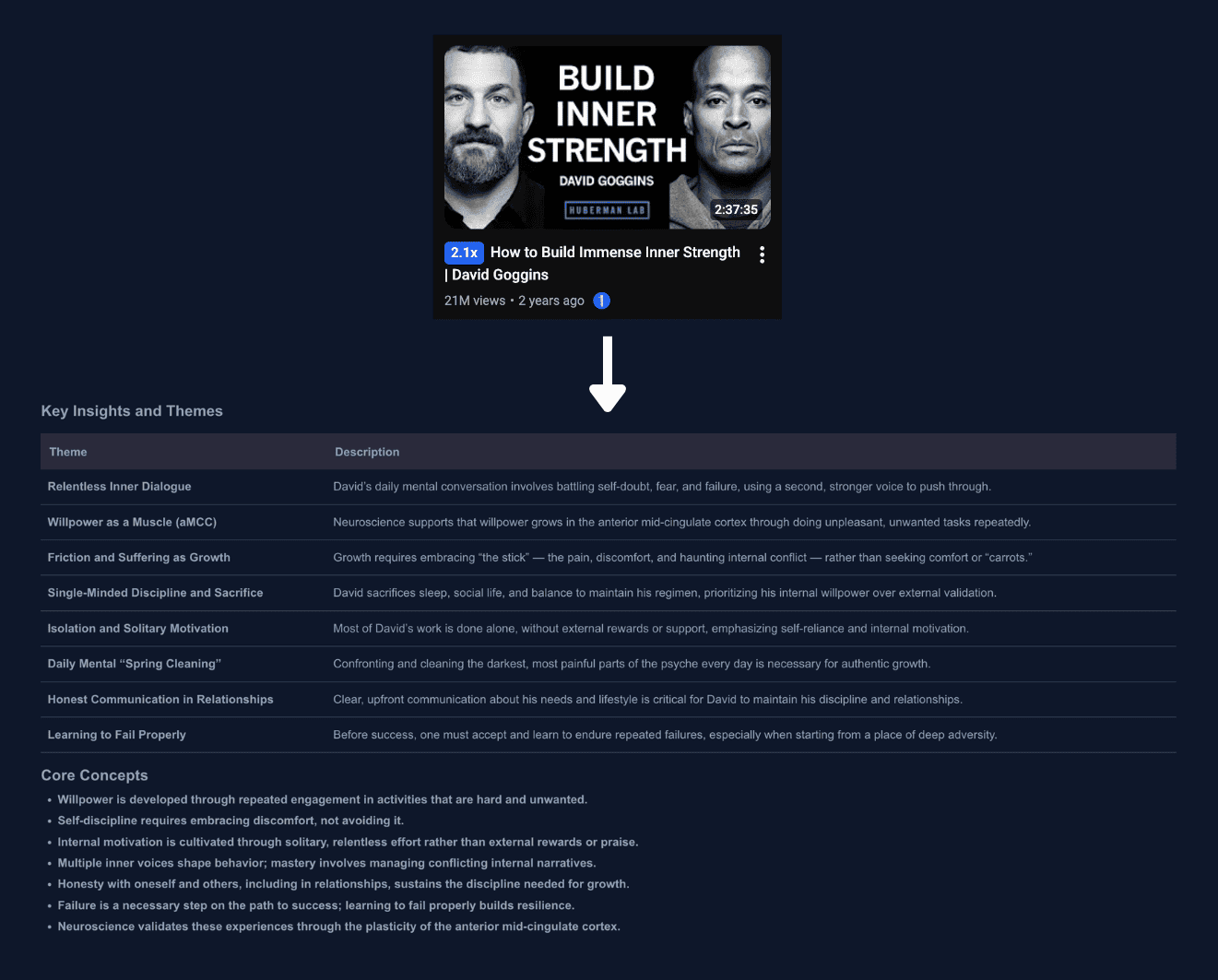This helps to get the core ideas and to determine if the podcast is worth listening to.